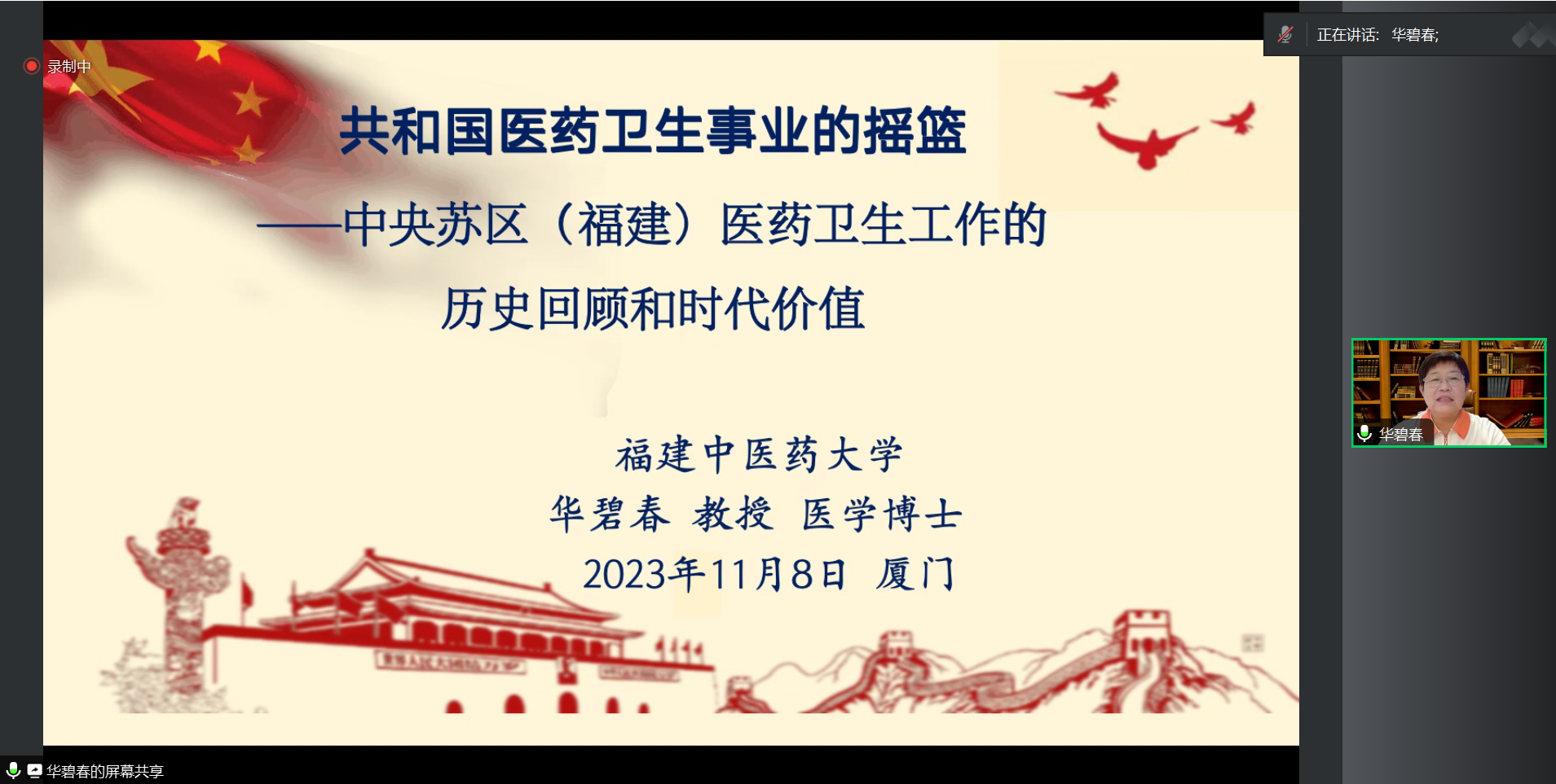 2023年11月8日晚,韩国h漫 组织全体党员参加了由医学伦理学与医学史学学系党支部承办的党史专题讲座。本次活动特邀请福建中医药大学华碧春教授在线讲授了主题为“共和国医药卫生事业的摇篮——中共苏区(福建)医药卫生工作的历史回顾和时代价值”的讲座。本次讲座由医学伦理学与医学史学学系党支部书记彭迎春副教授主持。 讲座由两部分内容组成。第一部分,华教授对中央苏区(福建)医药卫生工作的历史回顾和时代价值进行了分享,利用各类翔实的史料,图文并茂地分享了包括中央苏区(福建)医药卫生组织机构的建立与工作举措、中央苏区(福建)红军医院的建立、中央苏区(福建)的中医药以及中央苏区(福建)的医药卫生人才在内四个方面的内容。华老师表示,中央苏区(福建)医药卫生史是中共党史、中国人民解放军军史和中国医学史的重要组成部分,依据习近平主席的指示,我们应该“把红色资源利用好,把红色传统发扬好,把红色基因传承好”,重视和广泛应用中医药。讲座的第二部分,华教授将自己从事中央苏区(福建)医药卫生史料研究多年来的调研经验以及体会跟参会成员进行分享。她向我们展示了多年来保留完整的每一次访谈记录,同时也分享了获取史料来源的经验,认为史料的搜集不能只是对所研究主题进行单一搜集,并举例中医药卫生的史料搜集,要从政治、经济、文化、军事等各类不同领域对医药卫生相关信息进行挖取和搜集。在讲座最后的自由提问交流环节,华教授针对大家所提出的问题一一予以耐心解答。 华教授聚焦于医药卫生工作的历史回顾及其对于时代价值的深入分析,既有史料的挖掘分析,也有北上南下、田间地头的实地调研,同时还有大量文物旧址的原图呈现。这一系列的研究方法及孜孜不倦的钻研精神,值得从事医学人文社会学科的研究者们去学习探究。也让全体党员们更深入地了解了党的奋斗历史和光荣传统,汲取力量和智慧,在新时代为党和人民做出自己的一份努力。