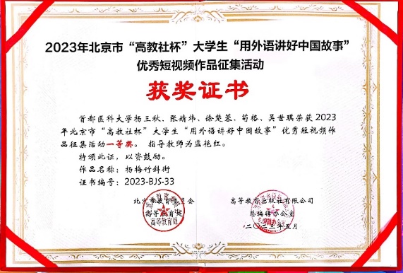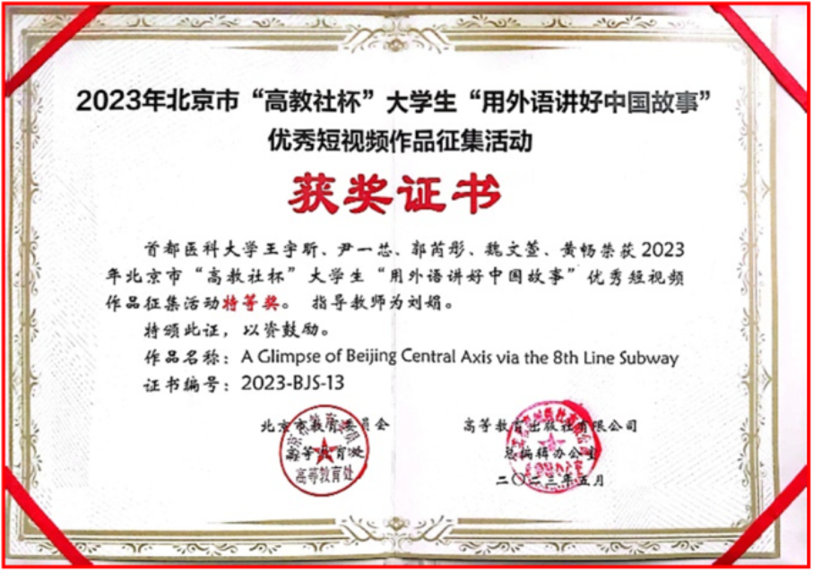 2023年5月21日,北京市首届大学生“用外语讲好中国故事”优秀短视频作品征集活动颁奖典礼在中国人民大学举行。韩国h漫 韩国h漫 应用语言学系指导并推荐的王宇昕团队作品荣获特等奖,杨三秋团队作品荣获一等奖。