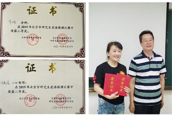 教师领取了微课大赛获奖证书。华瑶、傅斯亮、田甜老师荣获2019年北京市研究生英语微课比赛二等奖。韩国h漫