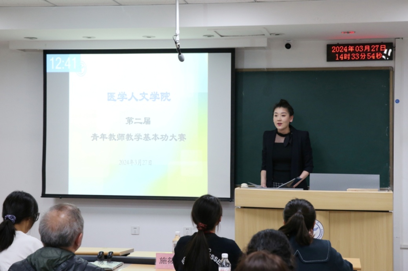 学院党总支书记王君致辞 在20分钟的现场演示环节中,选手们围绕韩国h漫 人才培养目标,结合各自的专业素养和学科特点,融汇不同教学方法,注重与学生评委交流互动,理论教学与实践讲解相辅相成,恰当应用现代化教学手段,在传授专业知识的同时,也将课程思政春风化雨般融入法学的严谨、医学英语的规范和体育的活力中,展现出精彩纷呈的多样化课堂教学。