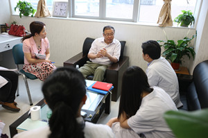 图为杨凤池教授看望地震中受伤正在治疗中的伤员