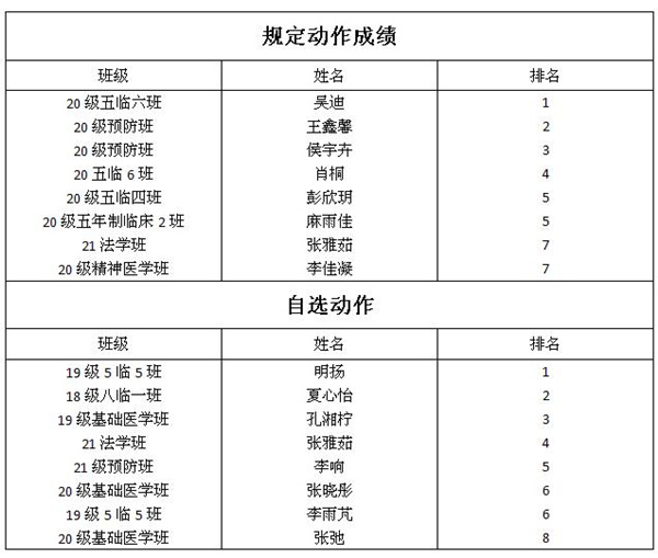 往年的比赛都是在体育馆里进行,受疫情影响,今年的健美操·舞比赛无论是在竞赛规则上还是竞赛场地上都作出调整。尽管没能亲临现场,但同学们在视频中的表现依旧可圈可点,活力四射,热情高涨。视频中同学们展现规范的技术动作,律动富有活力。复杂执裁的应用体育学系教师们认真不苟,对每一位同学的参赛视频进行精准打分,她们的公正评判也使得学生练习的得到积极的回报。 本次比赛设立了健美操·舞规定动作和自选动作两项。每位同学在充足准备之下,都取得令人满意的成绩: