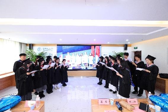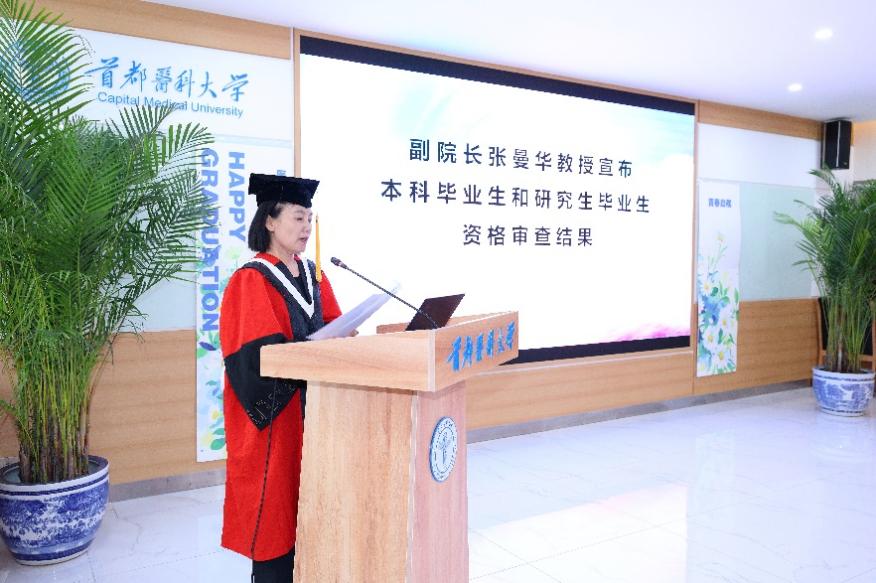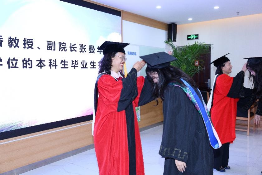 王君书记致辞 学院副院长张曼华教授宣读了学位资格审核结果。本届共有14名研究生获得硕士学位,19名本科生获得学士学位。在庄重的拨穗仪式上,院长卢凤香教授与张曼华副院长一同为毕业生们拨穗正冠,象征着学子们学有所成,即将展翅高飞。