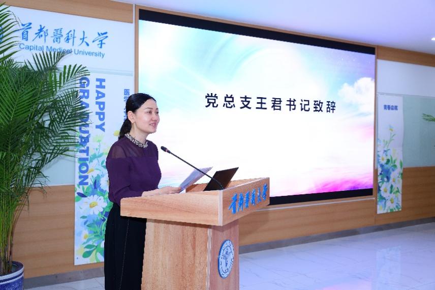 金玲玲副书记主持毕业典礼 在庄严的国歌声中,典礼正式拉开帷幕。 学院党总支书记王君首先致辞,她向圆满完成学业的同学们致以最诚挚的祝贺,并向辛勤付出的师长和家长表达衷心感谢。她勉励毕业生们坚守初心,在未来的道路上勇敢追梦,用智慧和担当书写人生新篇章。