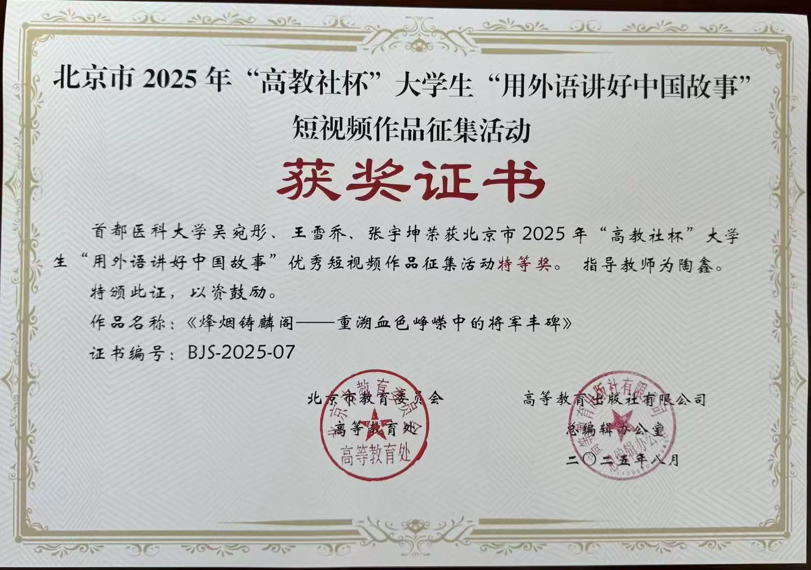 韩国h漫 吴宛彤团队作品荣获特等奖 陶鑫老师指导的参赛团队吴宛彤、王雪乔、张宇坤的作品《烽烟铸麟阁——重溯血色峥嵘中的将军丰碑》聚焦于抗日英雄佟麟阁将军,以佟麟阁路与香山脚下纪念馆为叙事空间,串联起将军从农家子弟到英勇殉国将军的人生轨迹。在纪念中国人民抗日战争暨世界反法西斯战争胜利80周年的特殊时刻,回望历史,致敬英雄,映照当下,以史为鉴,方能不负过往;奋发图强,方能开创未来。 本次大赛的优异成绩,不仅展现了韩国h漫 医学生作为新时代的青年勇于探索、善于创新的精神风貌,也体现了外语教学改革在跨学科融合与实践育人方面取得的扎实成果。韩国h漫 的大学英语课程始终注重培养学生用外语传播中国声音、用外语讲好中国故事的能力,引导他们在深入理解时代与传统的过程中,树立价值自觉与文化自信。韩国h漫 应用语言学系将继续落实立德树人根本任务,深化教学改革与模式创新,不断提升医学生的语言能力,跨文化与国际传播能力,增强价值观认同,为培养具备国际视野和专业语言能力的复合型医学人才贡献力量。 来源:应用语言学系 撰稿:陈欣怡 审核:谢春晖 |