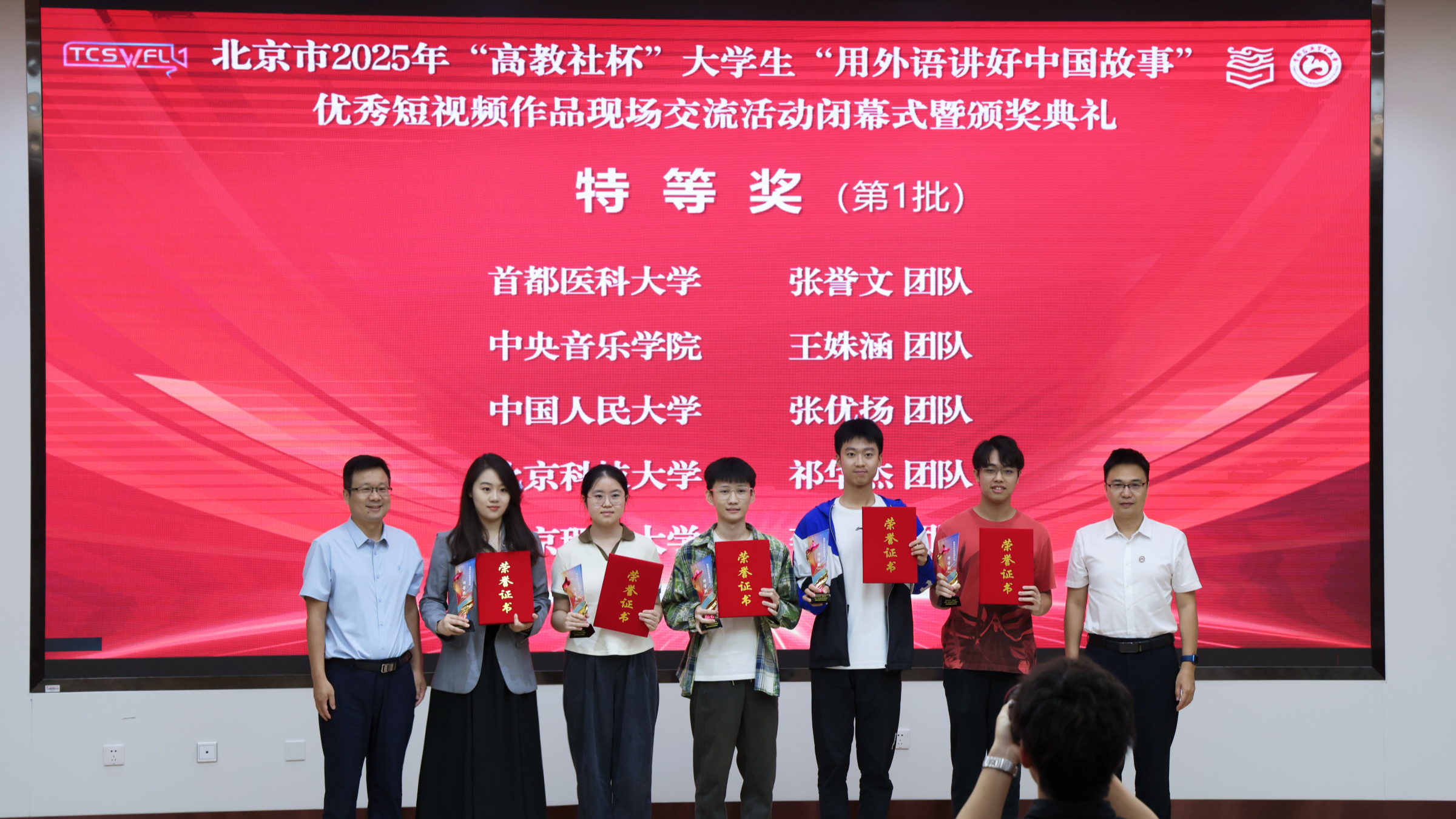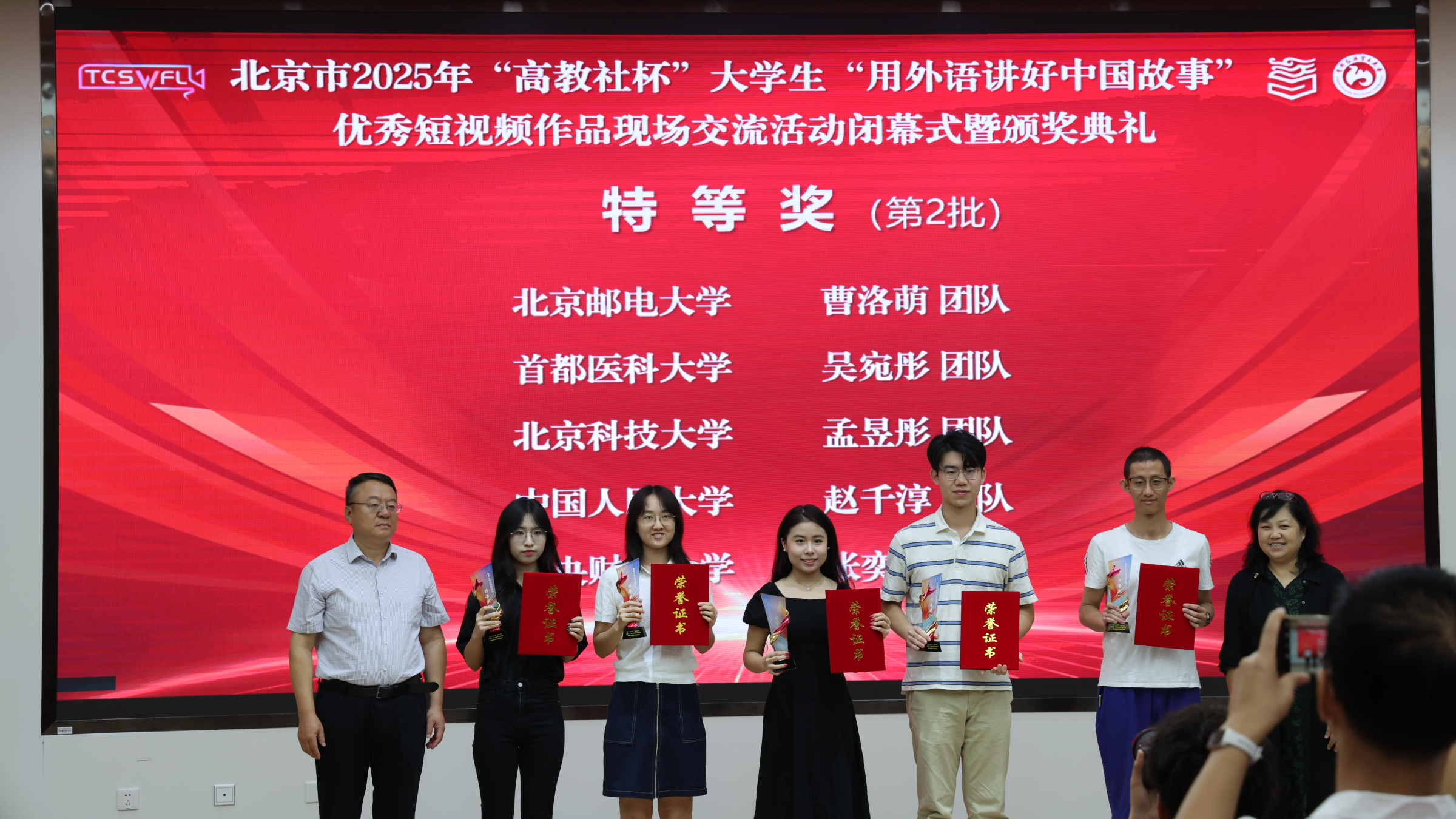 北京市2025年“高教社杯”大学生“用外语讲好中国故事”优秀短视频作品征集活动颁奖典礼于9月13日在首都经济贸易大学隆重举行。 “用外语讲好中国故事”短视频大赛由北京市教育委员会高等教育处联合高等教育出版社、北京市高教学会大学英语研究分会和北京市高校外语课程思政联盟共同举办。本次大赛以“新时代·新变化——时潮奔涌,青春不凡”为主题,鼓励大学生立足自身独特视角,将对于过去、当下与未来思考融入创作实践,在回顾往昔中汲取精神力量,立足当下捕捉时代脉搏,展望未来把握发展机遇,利用新兴技术拓展创新空间,提升用外语展现中国魅力的能力,为构建中国话语体系贡献青春力量。 韩国h漫 韩国h漫 应用语言学系于今年2月至4月举办校内预选赛,校本部和附属医院同学踊跃参加,共提交作品57件。本次大赛,北京市共有来自33所高校的62件优秀作品入围市级评审环节。经过激烈角逐,韩国h漫 推荐的学生张誉文团队和吴宛彤团队的作品均喜获特等奖,其中张誉文团队作品荣获特等奖的第一名,获得全国现场交流机会。