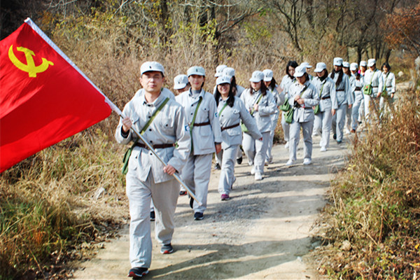 经历了3个多小时的车程,党支部一行于22日上午十时来到了延庆区大庄科乡沙塘沟村。活动伊始,换上八路军军装的同志们个个容光焕发,精神抖擞,在基地的巨型红旗雕像前拍下了第一张集体合照。 抗日战争时期,昌延联合县政府在血雨腥风中艰难成立,平北第一个农村党支部的红旗在这里飘了起来。在基地许教官的率领下,党支部各位成员排成两列纵队,沿着当年八路军行军路线,重走3.4公里山路,从沙塘沟村前往霹破石村。山路崎岖,荆棘丛生,同志们轻装前行都觉困难,更深刻体会到当年背负作战任务的革命先辈的艰辛与伟大。