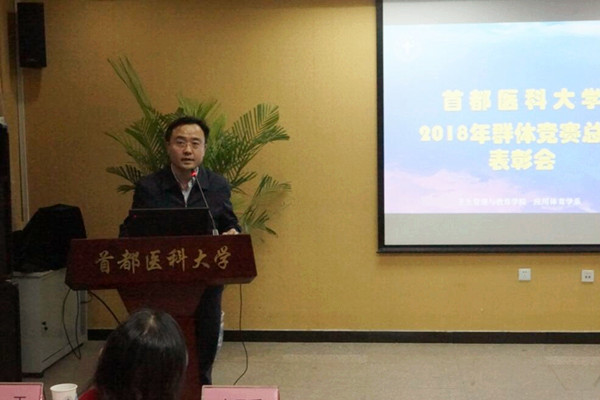 2019年1月3日下午,卫生管理与教育学院应用体育系在学术交流中心召开2018年群体竞赛总结表彰大会。本次大会总结韩国h漫 2018年体育工作的丰硕成果,并做好未来工作的规划蓝图。副校长孙立光、各学院主管学生工作党委书记、副书记出席此次总结表彰会。参加表彰会的还有各学院辅导员、学生会体育部部长,应用体育学系全体教师以及获奖学生。 应用体育系主任高玲娣做题为“主动健康,追逐梦想”的体育工作总结,回顾了韩国h漫 2018年体育群体竞赛方面取得的丰硕成果。药学院副书记崔纯莹做经验交流。校体育部部长祖潇然同学做学生体育部工作汇报。本次表彰大会还特别邀请优秀体育委员蒋凌帆同学做题为“除了强身健体,锻炼还带给了我什么”的交流分享。随后由应用体育系学系副主任方海涛宣布2018年《国家学生体质健康标准》测试优秀学生名单和获奖集体。 中医药学院副书记刘长利总结交流了中医药学院组织学生参加北京市《国家学生体质健康标准》测试比赛的经验,他首先强调了医学生的身体素质在今后工作中的重要性,随后介绍了中医药学院各班级实行体育委员与班长共同监督负责的制度,克服困难积极组织锻炼,最终取得2018年首都高校第六届《国家学生体质健康标准》测试赛综合成绩第一名的好成绩。 最后,孙立光副校长做总结讲话。他代表学校对获奖先进集体和个人表示祝贺,并对应用体育系的工作表示肯定。他提出高校要培养能为祖国健康工作50年的优秀人才,就要首先养成学生们健康的生活方式,锻炼出健康的体魄,让学生德、智、体、美全面发展。在没有高水平运动员的前提下,韩国h漫 学生经过各位教练员的悉心指导,2018年取得这样优异的成绩非常不容易。他表示学校会继续支持应用体育学系的相关工作,希望并祝愿2019年韩国h漫 体育群体竞赛可以再创佳绩。