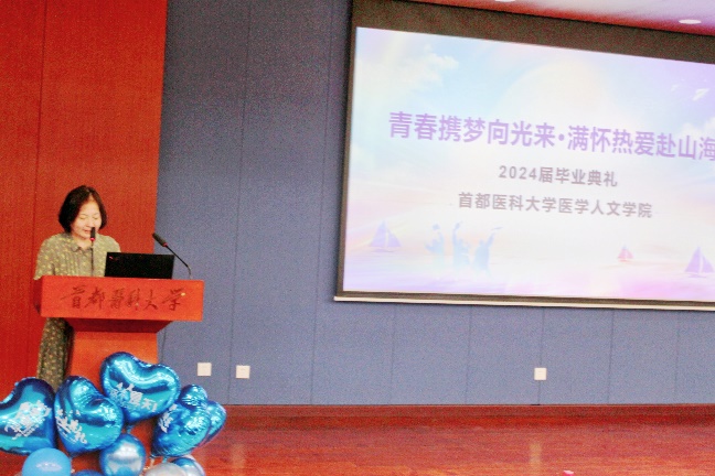 王君书记致辞 毕业典礼在庄严的国歌声中拉开帷幕。 学院党总支书记王君代表学院向毕业典礼致辞。致辞中,王书记向所有毕业生表示祝贺,向为学生成长辛勤耕耘的老师和家长表示由衷的敬意和诚挚感谢!她希望同学们未来依然要坚持不懈地追求梦想,坚守自己的信念和使命。并祝愿所有毕业生在未来的人生中继续书写精彩的篇章,取得更大成绩。