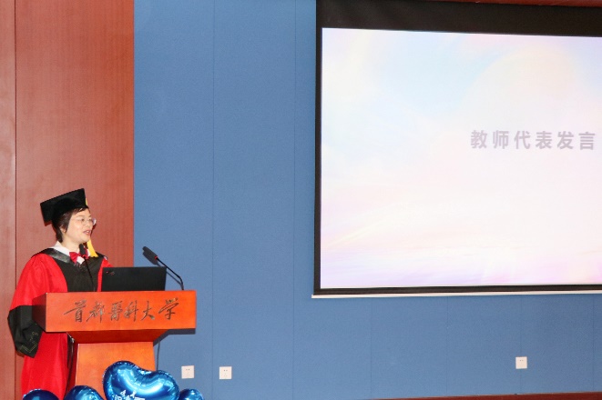 研究生导师代表彭迎春发言 研究生导师彭迎春副教授在祝贺同学们取得学业成果的同时,以其幽默而睿智的话语,希望同学们要掌握四种至关重要的能力:学习力、执行力、复盘力和幸福力。这些能力如同人生航船的风帆,决定着我们人生的深度、速度、高度和宽度。她的祝福如同一盏明灯,照亮学子们前行的道路。