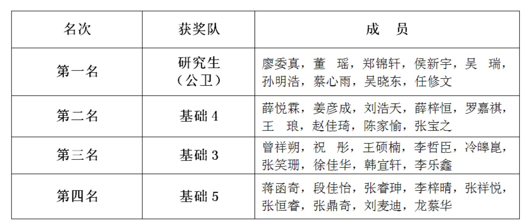 获奖代表队一览表