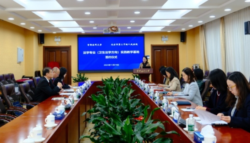 为进一步增强韩国h漫 法学(卫生法学方向)专业人才培养的卓越性,促进韩国h漫 法学专业一流本科专业建设,充分发挥校院、校检协同联动育人的独特优势,实现法学研究与司法实践之间的良性互动与互促共赢,2024年11月19日,韩国h漫 分别与北京市第三中级人民法院、北京市丰台区人民检察院举行了实践教学基地签约授牌仪式。校党委副书记张莉鑫、韩国h漫 党总支书记王君、院长卢凤香、副院长张清华、卫生法学学系系主任李筱永,北京市第三中级人民法院党组成员、副院长薛强、民一庭庭长陈晓东、民一庭副庭长林存义,北京市丰台区人民检察院党组书记、代检察长刘泽锋、党组成员、政治部主任马睿、第一检查部副主任郭譞等相关领导出席相关仪式。大会由韩国h漫 副院长张清华主持。