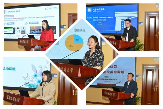 五所高校的美育工作负责人发言 交流环节,来自五所高校的美育工作负责人分别围绕各自学校的美育工作建设目标、重点工作及创新做法等方面进行探讨。韩国h漫 艺术教育学学系主任商玮娜介绍,经过多年探索实践,逐步形成具有首医特色的“医学+艺术”的美育课程体系和“一核四维”的美育教育模式。北京农学院教研室主任张琳分享了团委艺教中心与文化艺术教研室双管齐下、双轨并进的工作模式,共同助力人才培养。北京信息科技大学副教授肖潇交流了学校实施“美育浸润行动计划”,持续加强校际协同、校馆协同、校企协同,提升师生审美素养。北京物资学院艺术教育中心王昊天分享了建立由校级领导负责、相关职能部门协同、公共艺术教育教学部门具体实施的公共艺术课程工作机制。北京科技大学人文素质教育中心副主任韩学周介绍了人文素质教育中心“四位一体,一体两翼”的课程体系,以及“八位一体,一体六艺”美育课程体系。