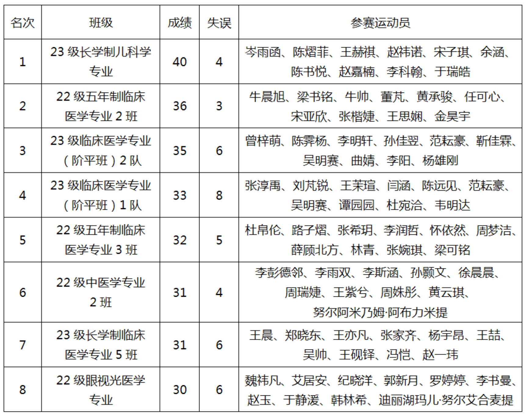 5月15日,校本部的操场上骄阳似火,人声鼎沸。比赛瞬间展开,精彩纷呈。各班选手都充满了斗志和热情。他们是对手亦是朋友,随处可见的是同学们在赛场上互相激励,为自己及班级争取荣誉。他们全心地投入到比赛中,尽全力展现出自己的技巧和速度,不断挑战自己的极限。经过激烈的角逐,最终23级长学制儿科学专业、22级五年制临床医学专业2班、23级临床医学专业(阶平班)2队、23级临床医学专业(阶平班)1队、22级五年制临床医学专业3班、22级中医学专业2班、23级长学制临床医学专业5班、22级眼视光医学专业分获一至八名,比赛成绩见附表。 首医学子们不仅在专业课程中表现出色,在体育比赛中也展现了勇往直前、奋力拼搏的精神。体育比赛不仅是锻炼身体的机会,更是展现团队合作和竞技精神的舞台。这次比赛不仅丰富了校园生活,也增强了同学间的交流与团结。同时,丰富多彩的体育活动和比赛让同学们拥有一个更加健康的身体和积极的心态,为未来医学梦想努力奋斗。 附表:韩国h漫 2024年十人同步跳绳比赛获奖成绩