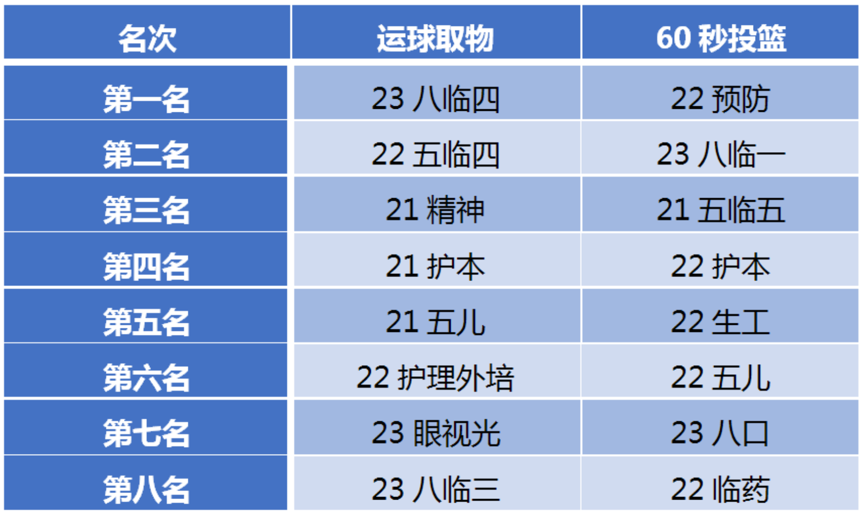 比赛过程中同学们个个全力投入力争第一,赛出了个人的风采,赛出了班级集体的凝聚力,比赛气氛热烈而又紧张,扣人心弦而又不失活泼,最后在比赛中23级八临四班和中22级预防班等班级分别获得了两项比赛的前八名。具体见下表:
