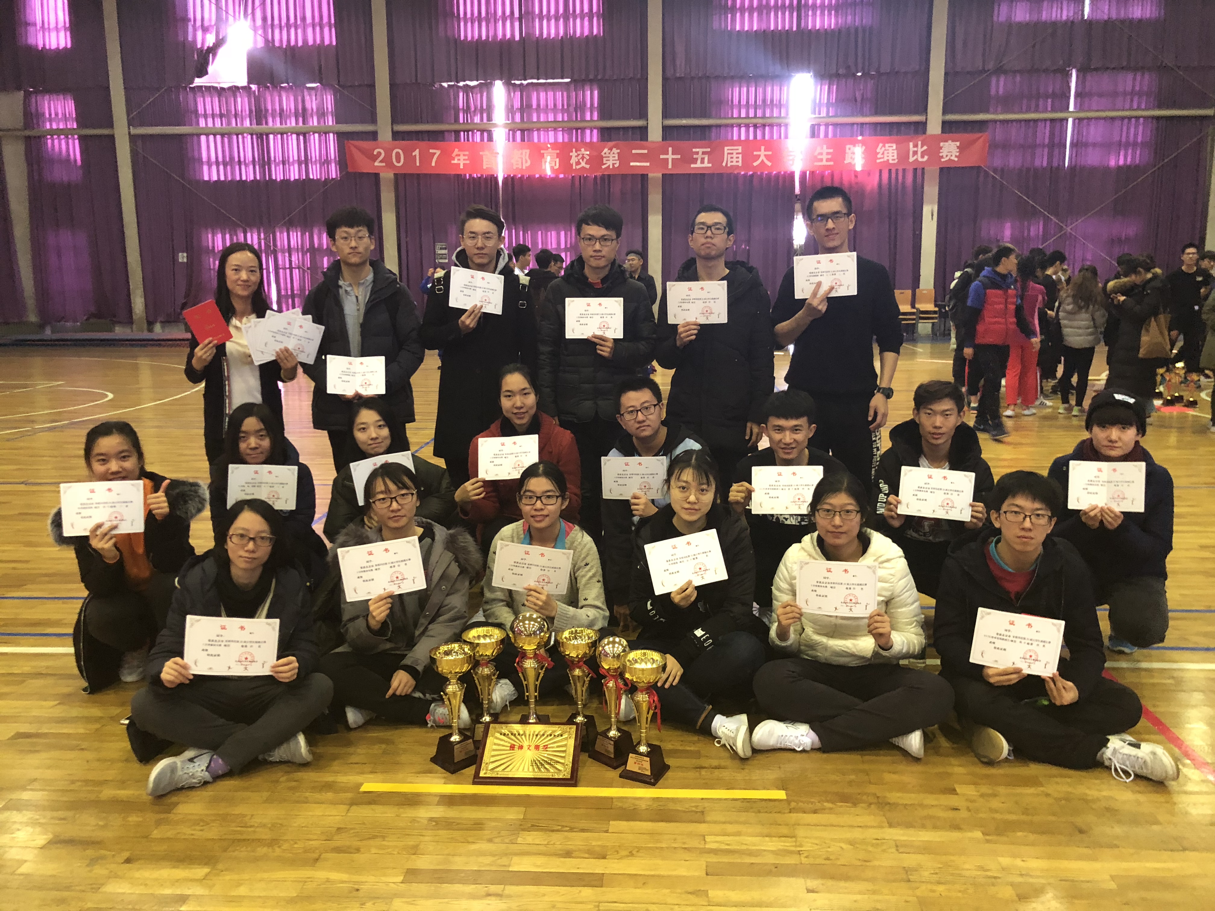 跳绳队22名运动员在体育学系许琛老师的带领下参加了2017年首都高校第二十五届大学生跳绳比赛,取得了3分钟集体长绳第四名、男子组30秒接力第四名、男子30秒双摇第三名和男子3分钟耐力单摇第八名的佳绩。
